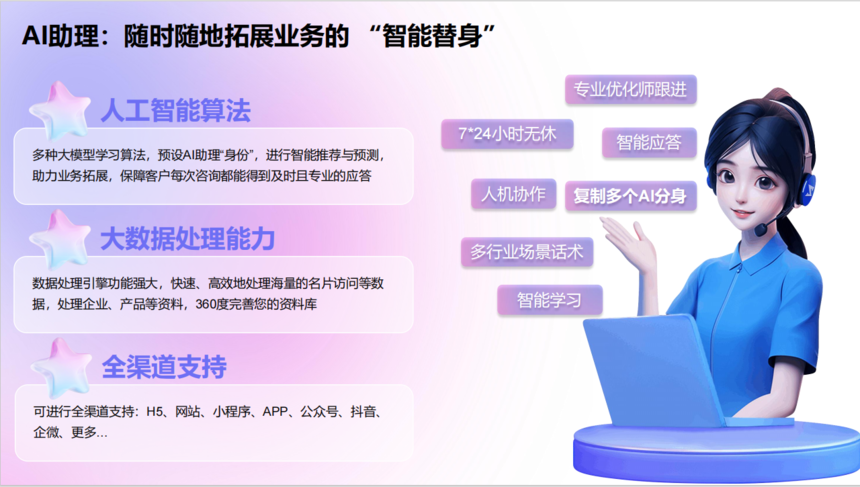 AI 助理与 AI 通话分析形成 “沟通双赋能”:前者基于 DeepSeek 大模型,支持 7×24 小时全渠道应答、多 AI 分身复制与行业话术适配,高意向客户自动推送负责人;后者能自动记录通话内容、描绘客户画像、生成谈单建议,还可纠正语速过快、倾听不足等销售问题,实测中帮助团队沟通效率提升 40%。